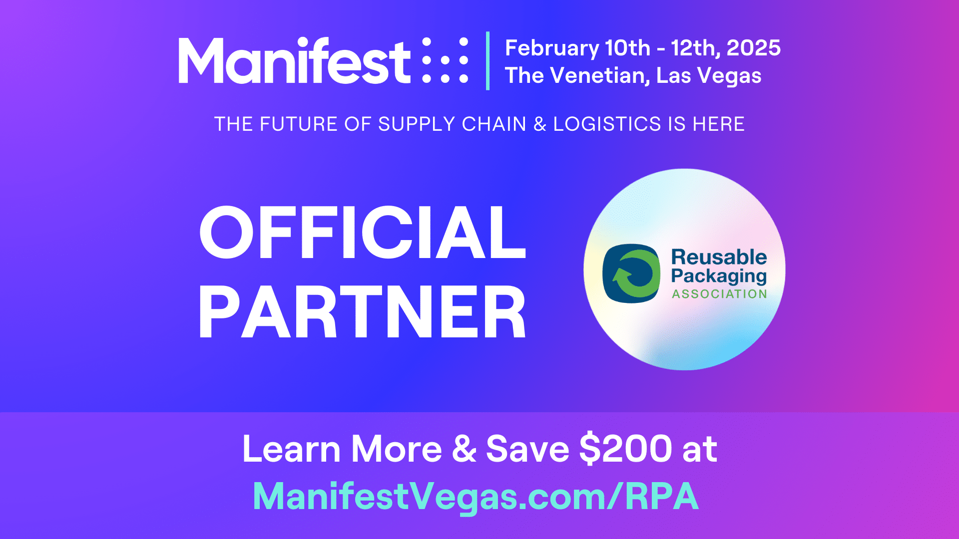 Don’t miss your chance to be part of the premier gathering of the global supply chain and logistics community. As a partner of Manifest Vegas, the Reusable Packaging Association is offering an exclusive discount to attendees. Register now to save an additional $200 off the current price (that’s $600 off the on-site price!) at ManifestVegas.com/RPA