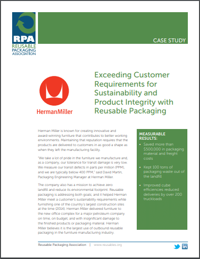 and we are typically below 400 PPM,” said David Martin, Packaging Engineering Manager at Herman Miller. The company also has a mission to achieve zero landfill and reduce its environmental footprint. Reusable packaging is addressing both goals; and it helped Herman Miller meet a customer’s sustainability requirements while furnishing one of the country’s largest construction sites at the time (2014). Herman Miller delivered furniture to the new office complex for a major petroleum company on time, on budget, and with insignificant damage to the finished products or packaging material. Herman Miller believes it is the largest user of outbound reusable packaging in the furniture manufacturing industry.